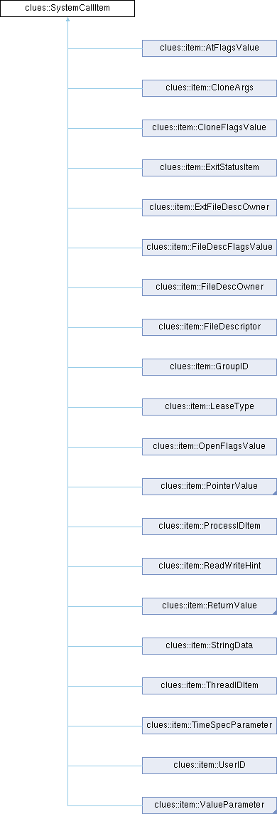 Inheritance diagram for clues::SystemCallItem:Public Types | |